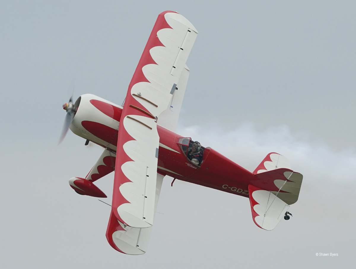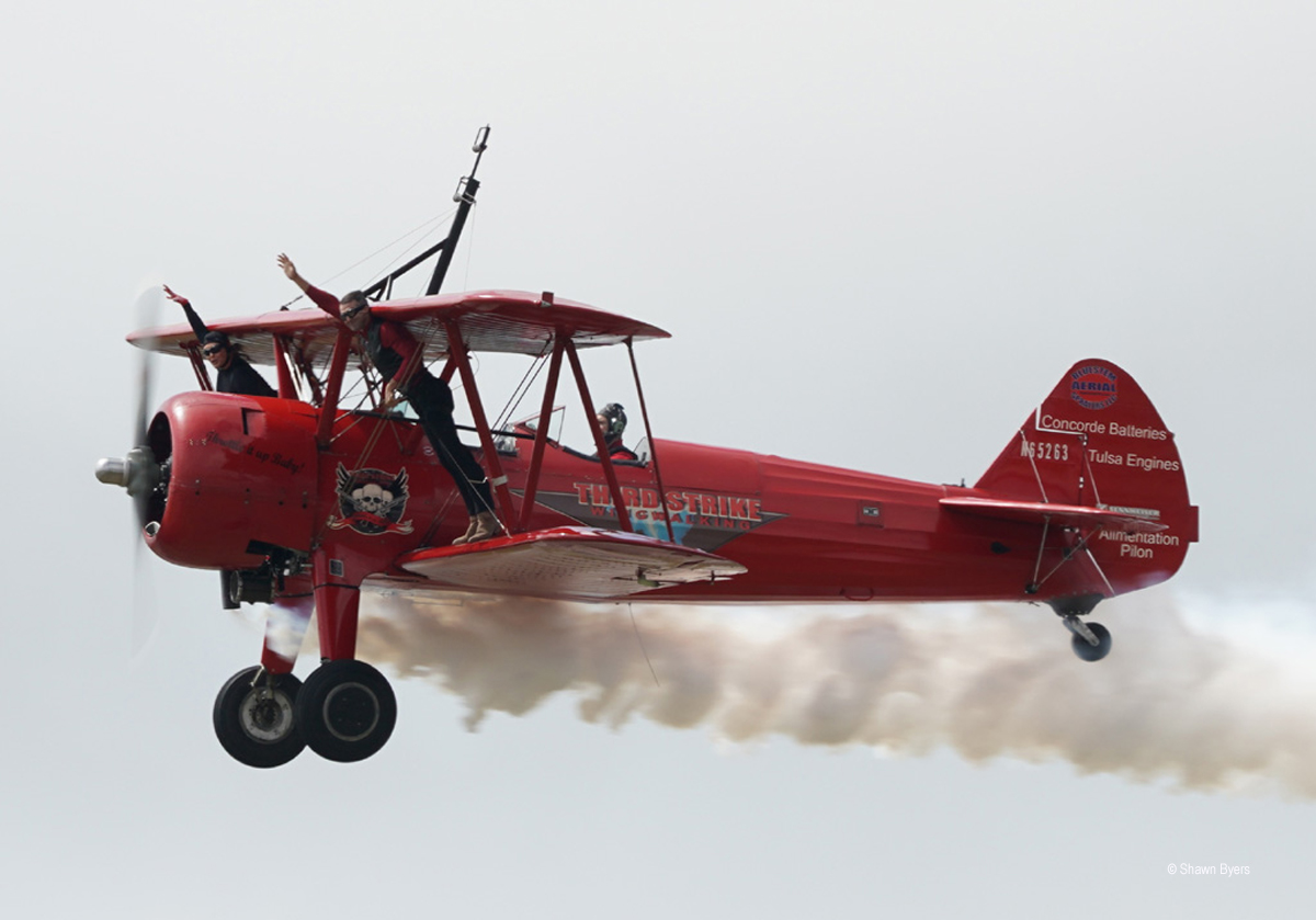 In the early block of acts, Trevor Rafferty performed a low and fast routine in his red Pitts 12S. Third Strike Wingwalking performed utilizing a red Stearman with not one, but two wingwalkers. Both acts were from Canada. A few weeks later, I spoke with a Canadian photographer at another show and he said they usually have three wingwalkers. Hence, “Third Strike”.